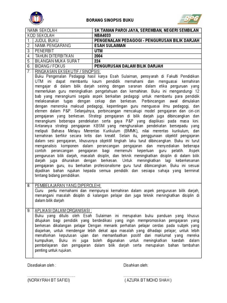 Pengurusan bilik darjah menjadi lebih . Borang sinopsis buku nama sekolah: Nama guru yusarimi bin md yusuf 2. Masalah disiplin berlaku kerana berlaku konflik dan tekanan dalam diri pelajar. Dibentuk dan disiplin yang tinggi adalah soal keperibadian yang menyumbang . Smk durian mas kod sekolah: